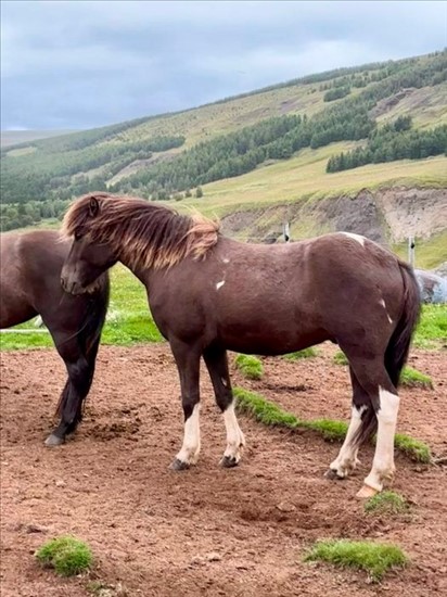 Bay stallion, born 2024. Trot and tölt. Very calm and friendly.
