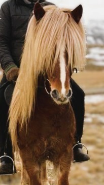 Chestnut (splash gen?) mare, shows trot and tölt, born 2017. ca. 3 months ridden. Powerful, for expericed riders.